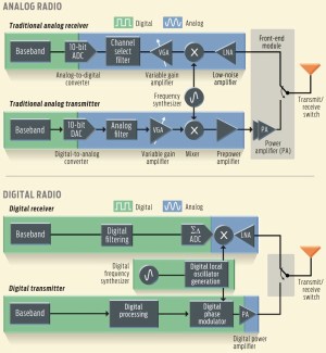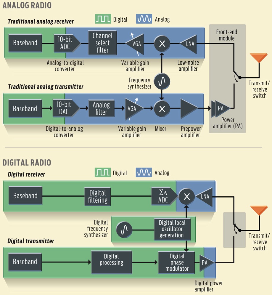 Chuyển các bộ thu phát sóng – hay ít nhất một vài thành phần của chúng – từ analog sang digital có thể sẽ xoá bỏ được khoảng cách công nghệ đó. Theo thời gian, mạch digital lấn sang lĩnh vực analog nhiều hơn. Một ví dụ điển hình là mạch PLL (phase-locked loop), một mạch quan trọng trong xử lý tín hiệu, đã được xây dựng từ các thành phần digital.
