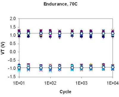 Sự thay đổi của đặc tính điện áp ngưỡng theo số lần chu kỳ ghi xóa là không đáng kể sau 10 ngàn lần ở 700 độ C (Hình 3). Còn đặc tính điện áp ngưỡng theo thời gian cho thấy sai biệt điện áp ngưỡng ở cuối vòng đời (End-of-Life Vt) vẫn lớn hơn nhiều so với sai biệt điện áp ngưỡng tối thiểu để nhận ra trạng thái của tế bào nhớ như Hình 4. (Theo thời gian, điện áp ngưỡng của trạng thái ghi (dương) có xu hướng giảm, và điện áp ngưỡng của trạng thái xóa (âm) có xu hướng tăng lên. Khi sai biệt điện áp ngưỡng (giữa trạng thái ghi và xóa) suy giảm đến các mức tối thiểu (minimum window), thì mạch đọc sẽ khó nhận biết được tế bào nhớ đang ở trạng thái ghi hay trạng thái xóa – người dịch).