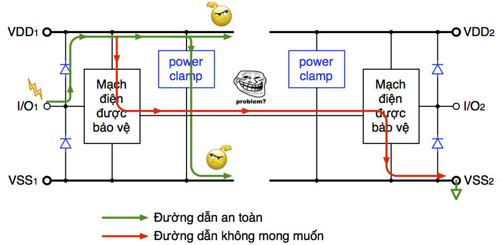 Vấn đề là liệu các mạch bảo vệ ESD trên có khả năng dẫn dòng ESD đi vòng qua các mạch điện được bảo vệ hay không trong trường hợp các chân chịu ảnh hưởng của ESD nằm ở hai nguồn cấp điện khác nhau. Câu trả lời là không. Một ví dụ cho tình huống này được trình bày trong Hình 16. Trong ví dụ này, hiện tượng ESD xảy ra giữa chân I/O1 nằm trong nguồn cấp điện thứ nhất và chân VSS của nguồn cấp điện thứ hai. Đầu tiên dòng điện ESD được dẫn từ I/O1 sang VDD1 nhờ một diode (theo đường mũi tên màu xanh lá cây). Từ đây dòng điện phải được dẫn sang VSS2 bằng một cách nào đó. Do không có đường dẫn điện giữa VDD1 và VDD2 cũng như giữa VSS1 và VSS2, dòng điện ESD không có cách nào đi sang VSS2 thông qua các dây nguồn (power bus). Kết quả là dòng điện ESD sẽ tìm một con đường khác, con đường đi xuyên qua các mạch điện cần được bảo vệ (theo đường mũi tên màu đỏ), để có thể thoát ra ngoài. Khi dòng điện ESD chạy xuyên qua các mạch điện vốn không được thiết kế để dẫn dòng điện lớn như dòng ESD thì nó sẽ làm hư hỏng chúng.