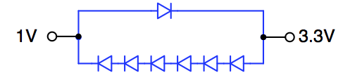 Vấn đề này được giải quyết một cách khá đơn giản: thay vì dùng chỉ một diode, ta dùng nhiều diode mắc nối tiếp trên một nhánh của mạch anti-paralllel diodes để tăng điện áp ngưỡng của nhánh đó. Ví dụ cụ thể chẳng hạn như trong Hình 19: V1 được nối với VDD của phần core có điện thế 1V còn V2 được nối với VDD của phần I/O có điện thế 3.3V. Khi đó chênh lệch V2 – V1 sẽ là 2.3V. Ta sẽ cần khoảng 5 diode mắc nối tiếp ở nhánh bên dưới của mạch anti-parallel diodes để có được điện áp ngưỡng khoảng 2.5V (giả sử điện áp ngưỡng của 1 diode là 0.5V). Mức điện áp ngưỡng này đủ cao để đảm bảo các diode không dẫn điện trong điều kiện hoạt động bình thường.
