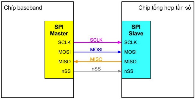 Hình 3: Hệ thống thu phát không dây có thể sử dụng một chíp baseband để xử lý tín hiệu. Chíp baseband điều khiển chíp tổng hợp tần số để tạo tín hiệu sóng mang cho toàn bộ hệ thống thu phát không dây. Hai con chíp sử dụng giao tiếp SPI để truyền các tín hiệu điều khiển. Chíp baseband chứa mạch SPI Master còn chíp tổng hợp tần số chứa mạch SPI Slave.