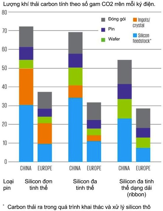 Phát thải carbon: các nhà sản xuất tấm pin mặt trời cần có điện và nhiệt. Mức thải carbon của họ phụ thuộc rất nhiều vào vị trí địa lý. Các tấm pin sản xuất ở Trung Quốc, với điện năng chủ yếu từ than đá, có mức thải carbon lớn hơn các tấm pin sản xuất ở Châu u. Nguồn:Fengqi You và các cộng sự, Argonne National Laboratory.