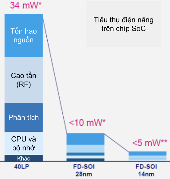 Hiệu năng của transistor trên FD-SOI tốt hơn 30% so với công nghệ bulk. Công nghệ này sử dụng ít lớp mặt nạ hơn, có tỉ lệ chíp được sản xuất thành công (yield) cao hơn và số lớp kim loại thì tương tự như bulk, Ben-Hamida nói. “Nói tóm lại, FD-SOI cho chúng ta thêm một cực cổng để điều chỉnh hiệu năng, kiểm soát transistor NMOS và PMOS… nhưng hiện tại các công cụ thiết kế còn chưa theo kịp, có lẽ điểm mấu chốt là khả năng của các công cụ hỗ trợ thiết kế,” ông nói thêm.