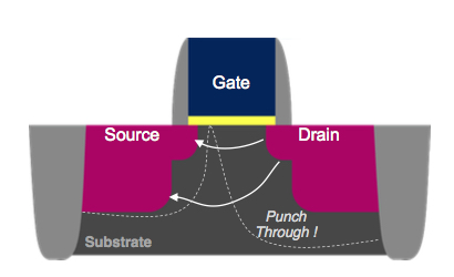 Khi đến mức 28/20nm thì công nghệ bán dẫn phẳng vấp phải nhiều hạn chế. Vùng kênh dẫn bên dưới cực cổng trở nên quá ngắn và cực cổng không còn đủ mạnh để điều khiển nó một cách chính xác nữa. Cực cổng có thể điều khiển phần trên của kênh dẫn nhưng càng đi xuống bên dưới thì khả năng điều khiển kênh dẫn càng kém đi. Cụ thể, khi cực cổng ở trạng thái tắt thì vẫn còn những đường dẫn giữa cực source và cực drain và điều này làm cho dòng rò trở nên rất cao. (Xem hình bên trên.) Rõ ràng là ta cần phải có một kiến trúc mới cho các transistor.