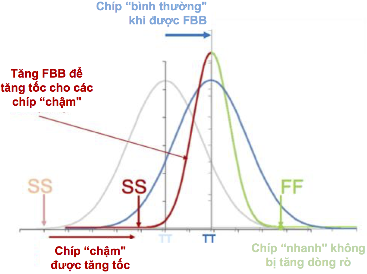 FBB còn có thể được dùng để giảm thiểu việc phải thiết kế vượt yêu cầu (overdesign) bằng cách làm cho các con chíp “chậm” (slow) và “bình thường” (typical) hoạt động nhanh hơn. Điều này làm thay đổi xác suất phân bố của các con chíp theo hướng nhanh hơn và ít phân tán hơn. Một trong những điểm đáng giá của quy trình 22FDX của GlobalFoundries là nó có thể giảm điện áp nguồn xuống đến tận mức 0.4V.