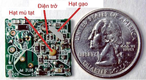 Những hình ảnh này làm ta rất dễ quên mất rằng các linh kiện này nhỏ như thế nào, và bộ sạc đã tích hợp tất cả những thứ phức tạp đó vào trong một khối nhỏ ra sao. Hình ảnh được phóng đại một chút dưới đây cho thấy một đồng 25 xu Mĩ, một hạt gạo, và một hạt mù tạt để ta có thể so sánh kích thước. Hầu hết các linh kiện này là loại dán bề mặt nghĩa và được hàn trực tiếp lên bản mạch in. Những linh kiện nhỏ nhất, chẳng hạn như điện trở được chỉ ra trong hình, là loại “0402″ do chúng có kích thước 0.04inch x 0.02inch. Những linh kiện lớn hơn nằm về phía bên trái của hạt mù tạt có khả năng chịu dòng lớn hơn và thuộc loại “0805″ do chúng có kích thước 0.08inch x 0.05inch.
