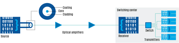 Căn bản về sợi quang hiện đại: Tín hiệu điện được chuyển thành tín hiệu quang tại nguồn phát [bên trái] rồi đưa lên sợi quang. Các bộ khuếch đại quang học được chế tạo từ sợi quang có bổ sung các thành phần đặc biệt sẽ khuếch đại tín hiệu. Ở trung tâm chuyển mạch, một bộ thu sẽ lấy tín hiệu từ các sóng mang và chuyển nó sang dạng điện. Bộ chuyển mạch sẽ phân chia và hướng dẫn luồng tín hiệu tới các bộ phát để chuyển tín hiệu sang dạng ánh sáng rồi gửi lên sợi quang để đến đích kế tiếp. (Minh hoạ: Erik Vrielink)