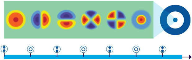Các mode của tín hiệu bên trong sợi quang: Tín hiệu ở các “mode” khác nhau—có phân bố không gian khác nhau—có thể được truyền trên cùng một sợi quang để tăng dung lượng. Ánh sáng ở trong một mode sẽ có cường độ khác nhau ở các điểm khác nhau trên cùng một mặt cắt. Hình trên là ví dụ về hình dáng của các mode khi được đưa lên sợi quang. Phần dưới của hình cho thấy cách thức mà một mode có thể thay đổi giữa các trạng thái khác nhau khi nó di chuyển dọc theo sợi quang. (Minh hoạ: từ P.J. Winzer, Bell Labs Technical Journal, vol. 19, pp. 22–30 (2014))
