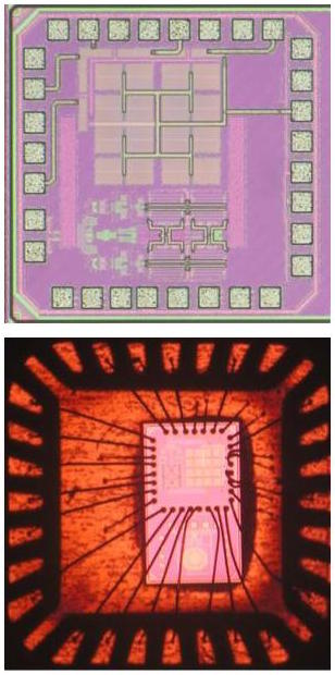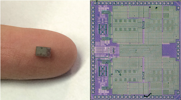 Chíp tích hợp circulator không từ tính đầu tiên. Nó có khả năng “xoắn” phân cực của một sóng điện từ. [hình trên: chíp circulator, hình dưới: chíp sau khi được đóng gói]. Hình: Negar Reiskarimian.
