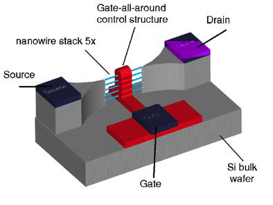 Transistor kiểu gate-all-around cũng chứa ba nanowire hay nhiều hơn. Các nanowire, tạo thành các kênh dẫn, được nối với cực source và cực drain. Kích thước của chúng thì rất đáng kinh ngạc. Chẳng hạn, IMEC mới đây trình diễn một transistor kiểu gate-all-around với các nanowire có đường kính 8nm.